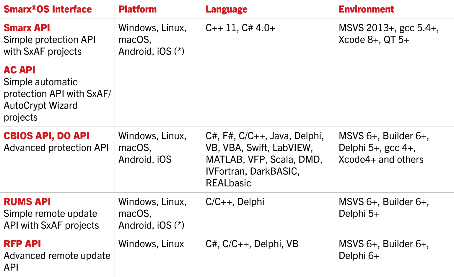 Smarx OS consists of several APIs that provide different subsets of functionality. Not all API subsets are available for each platform/compiler.