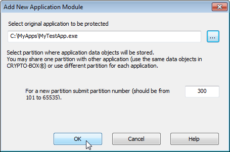 Next, specify the number of the CRYPTO-BOX partition in which the application protection settings (data objects) will be stored. The number of the partition must be in range between 101 and 65535.