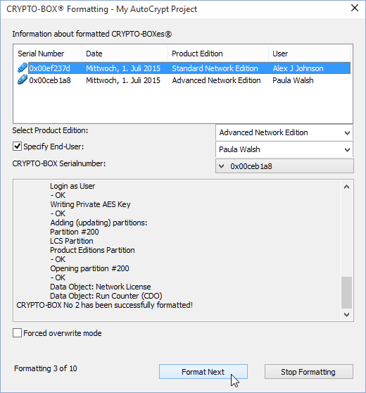 | If you get an error message during formatting that Administrator login to the CRYPTO-BOX has failed, check if you specified the correct hardware profile in your project. See here for more information. |