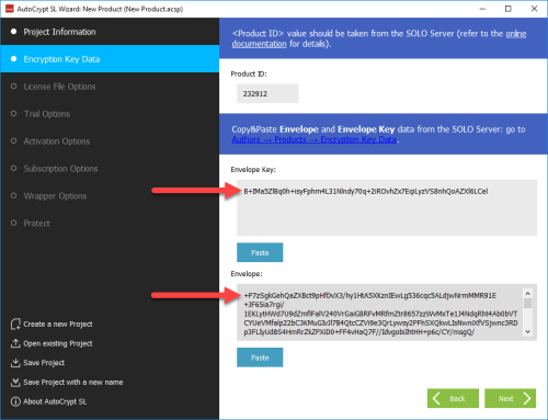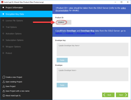 In the ACSL wizard the Product ID and Encryption Key Data must be retrieved from SOLO Server. Using this data ensures that only licenses from your SOLO Server account will be able to activate your software.