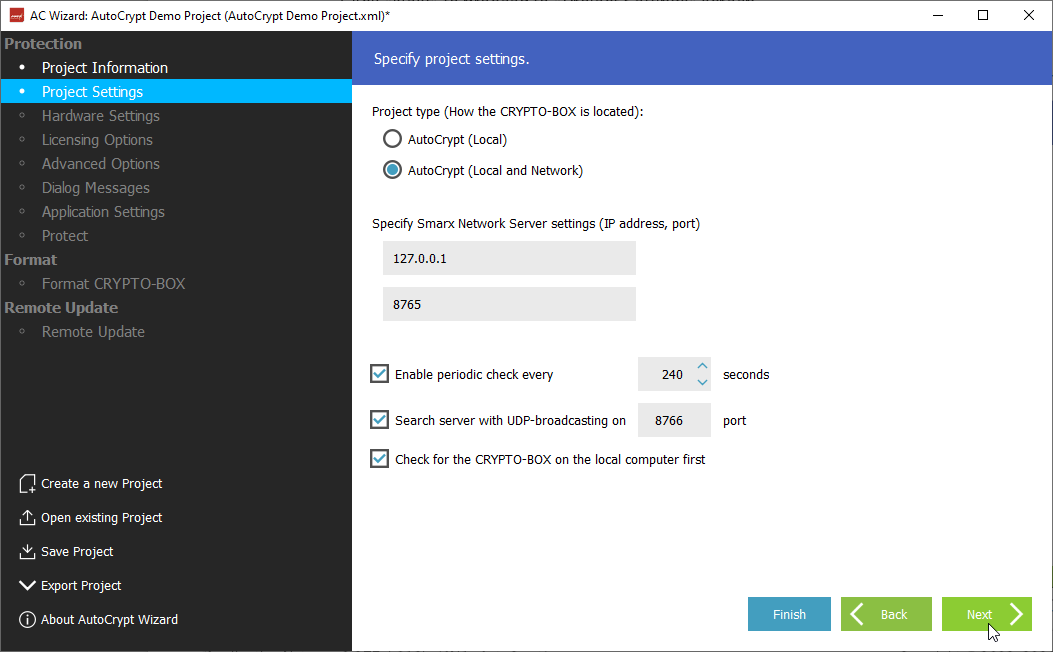 First, select the project type. AutoCrypt projects can be either local (applications are protected with a CRYPTO‑BOX on local PC) or network-based (applications are protected with a CRYPTO-BOX located on the Server).