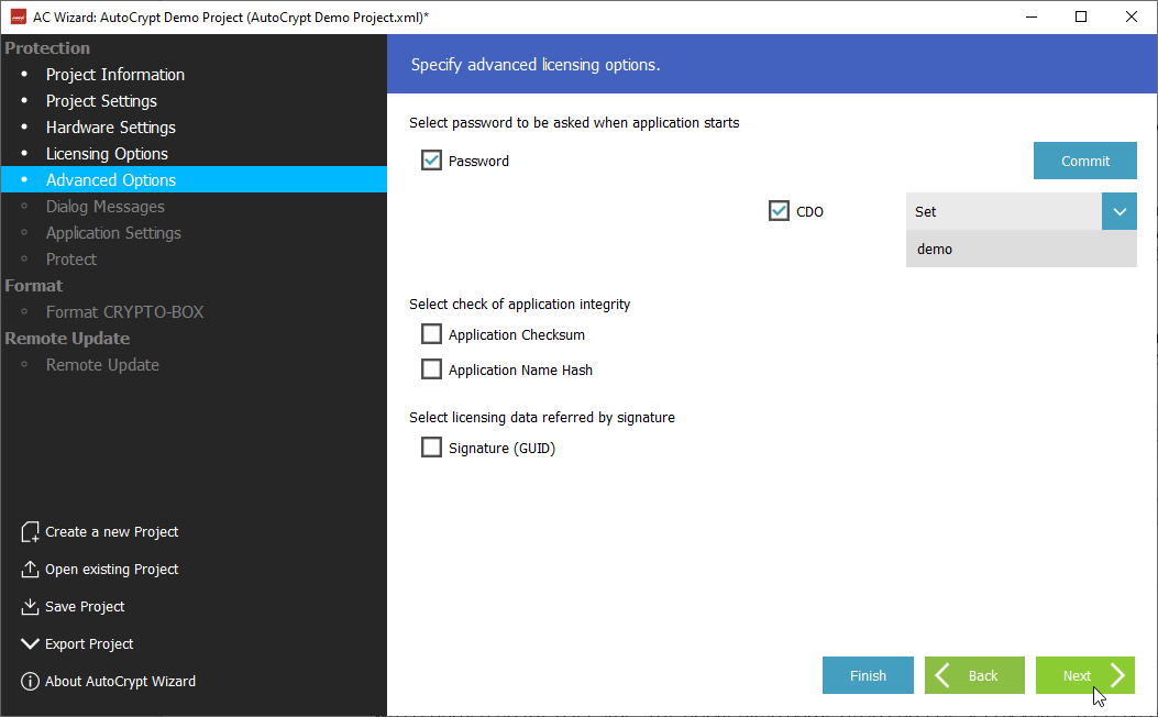 This data object is specific to AutoCrypt projects: it contains a hash value calculated for the name of protected application. This hash value will be stored in the CRYPTO-BOX and used to check if the application was renamed on the user side. The application name hash can’t be set by value; it is calculated after successful application protection.