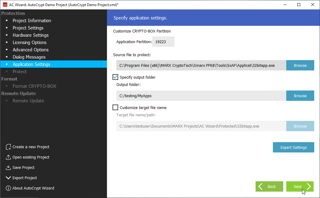 | For testing purposes, you can use one of the predefined test applications: Click “Browse” to open the samples application folder. If you use the PPK, the sample applications are at: [Smarx OS PPK root folder]\Tools\SxAF\Applicat If you use the AutoCrypt Wizard Package, the sample applications can be found at: [AutoCrypt Package root folder]\Demo Select the desired Win32/Win64 sample application or Win32Dll.dll/Win64Dll.dll for sample DLL. You can test the protected DLL with the DllLauncher.exe/ DllLauncher64.exe program. |