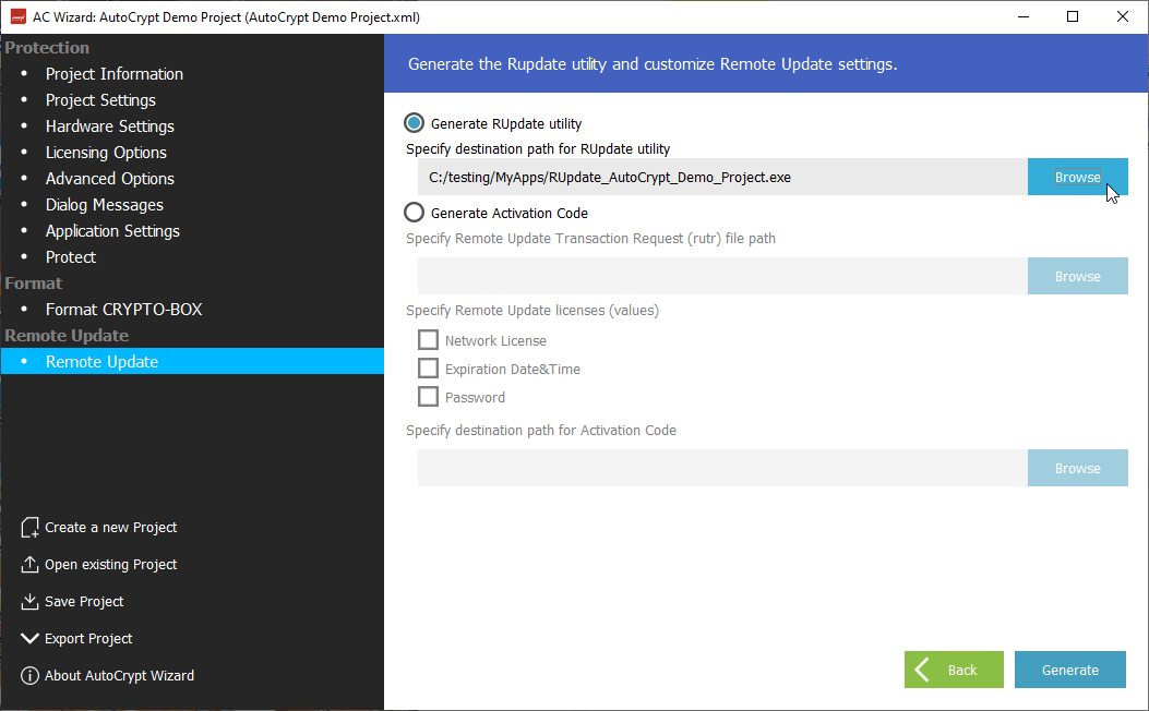 Select the “Generate RUpdate utility” radio button. Now click “Browse” to select the path where the Remote Update Utility should be extracted to, and the file name. Then click the “Generate” button.
