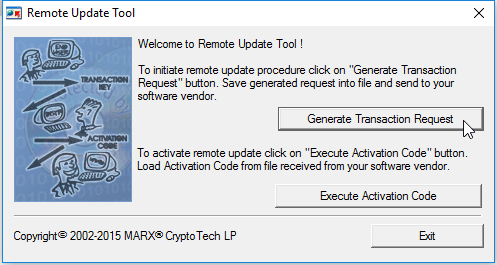 In order to initiate a Remote Update, the end user connects the CRYPTO-BOX to his computer and starts the RUpdate Utility. Now he needs to click the “Generate Transaction Request” button:
