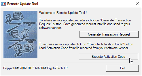To do so, the end user launches the Remote Update Tool, attaches the CRYPTO-BOX and clicks the “Execute Activation Code” button. The unique transaction code (generated for each request) ensures that only the CRYPTO-BOX which was attached during transaction code generation can be updated.